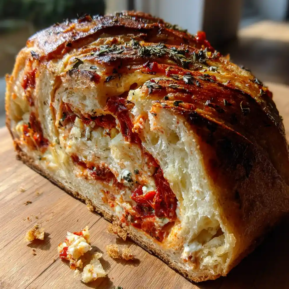 Evenly spread the Roasted Red Pepper and Feta Swirl mixture over one of the dough rectangles, leaving a small 1 cm (ยฝ inch) border around the edges. Carefully place the second dough rectangle directly on top of the first, pressing down gently to seal the edges. Starting from one of the long edges, tightly roll the layered dough into a log, then gently twist it 2-3 times to create a visible swirl pattern before shaping it into an oval loaf. - Bake and Cool