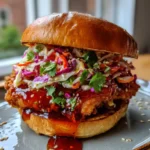This hot honey chicken sandwich features perfectly fried chicken with a sweet and spicy kick, served on a soft bun with a vibrant, creamy gochujang slaw. It is a hearty, family-friendly meal that transforms weeknight dinners into something special.