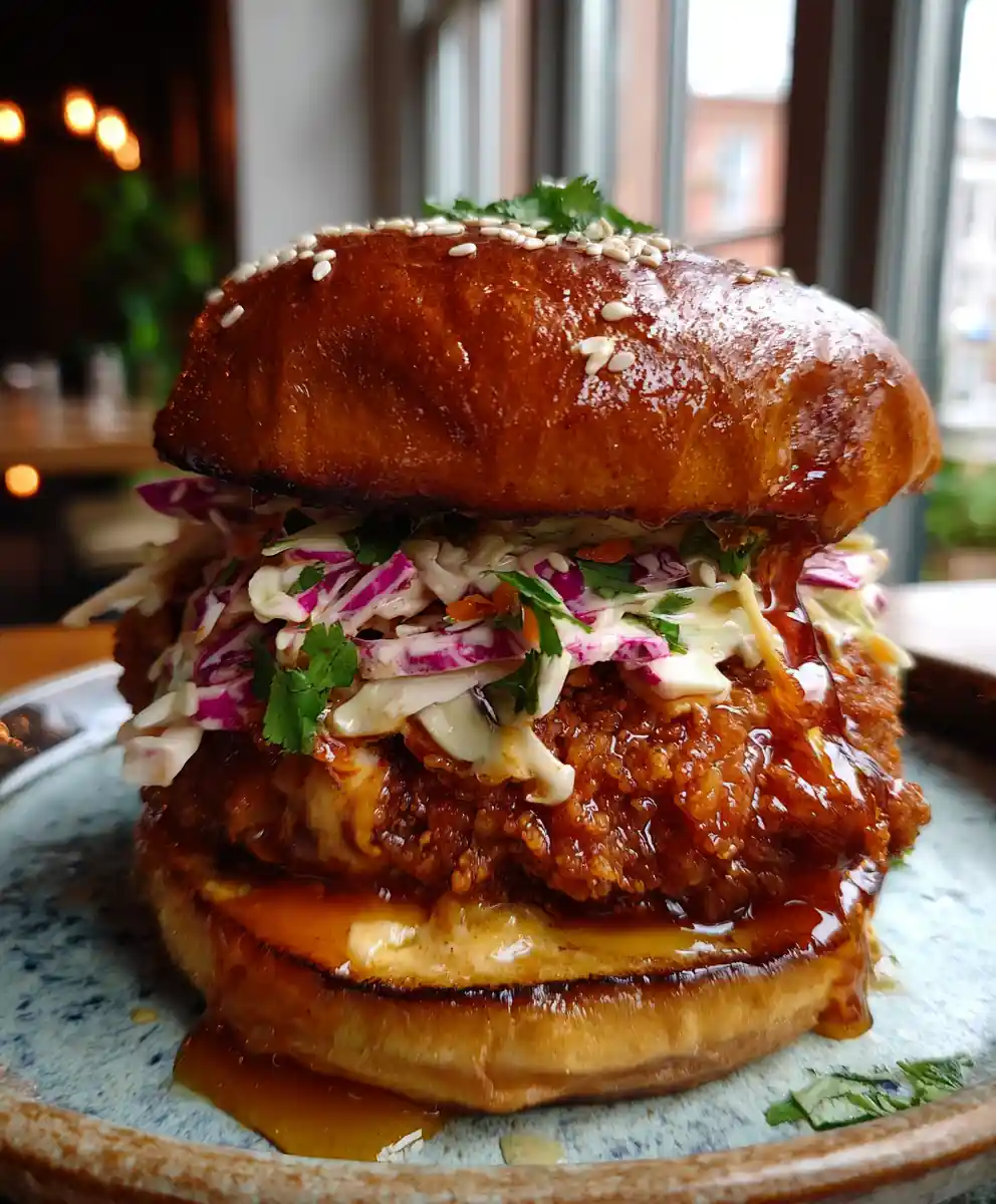 - Assemble the Sandwich: Toast the brioche buns until golden. Spread a layer of the creamy gochujang slaw on the bottom bun, add a hot honey chicken thigh, top with more slaw, and finally the top bun. Serve immediately with any extra hot honey; garnish with sesame seeds and cilantro.