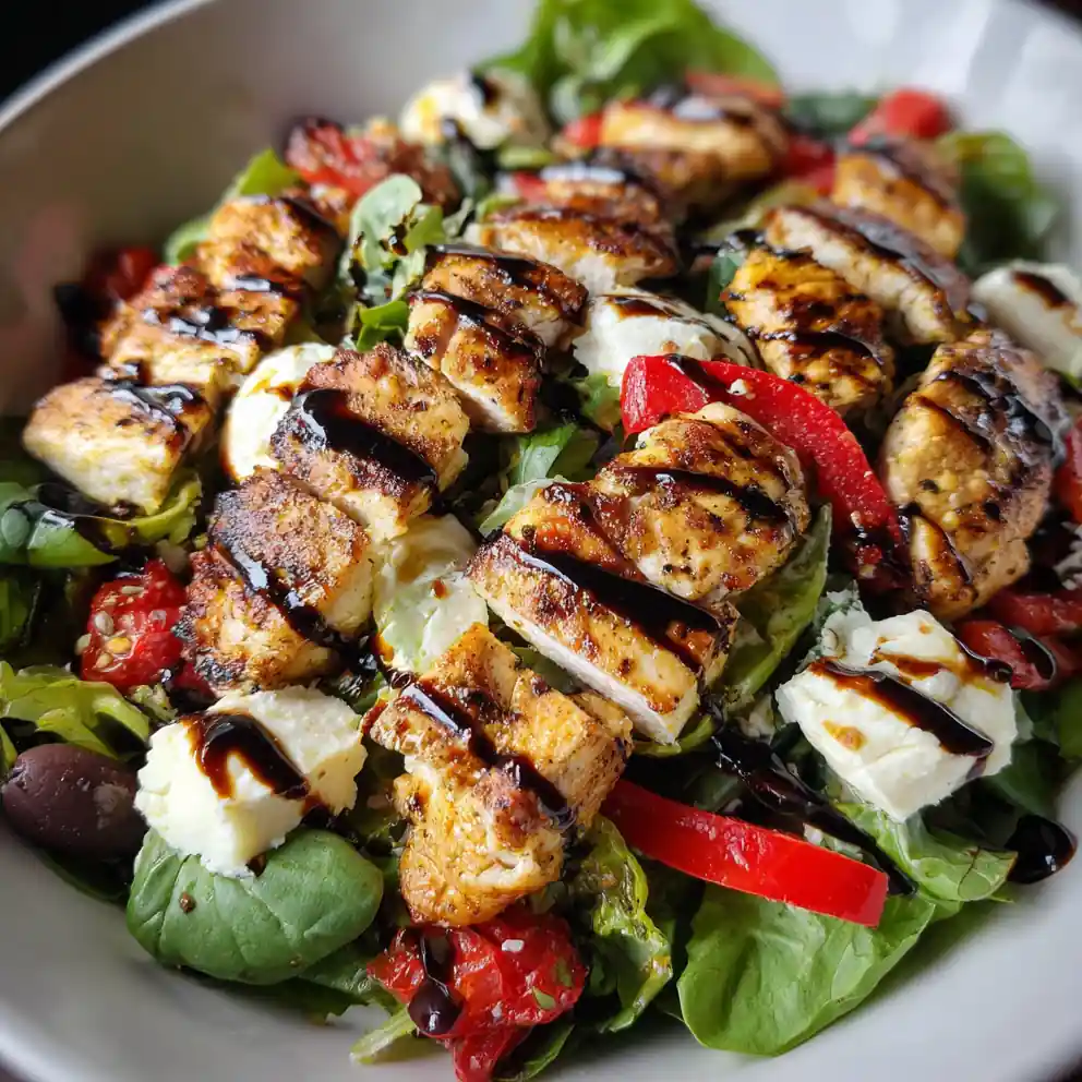 - Assemble the Salad: In a large salad bowl, combine the mixed greens, cubed mozzarella, roasted red peppers, pepperoncini, Kalamata olives, sun-dried tomatoes, toasted pine nuts, and the sliced chicken. Drizzle the dressing over the top and toss gently to ensure everything is evenly coated. Be careful not to overdress the salad; you want a light coating, not a soggy mess.