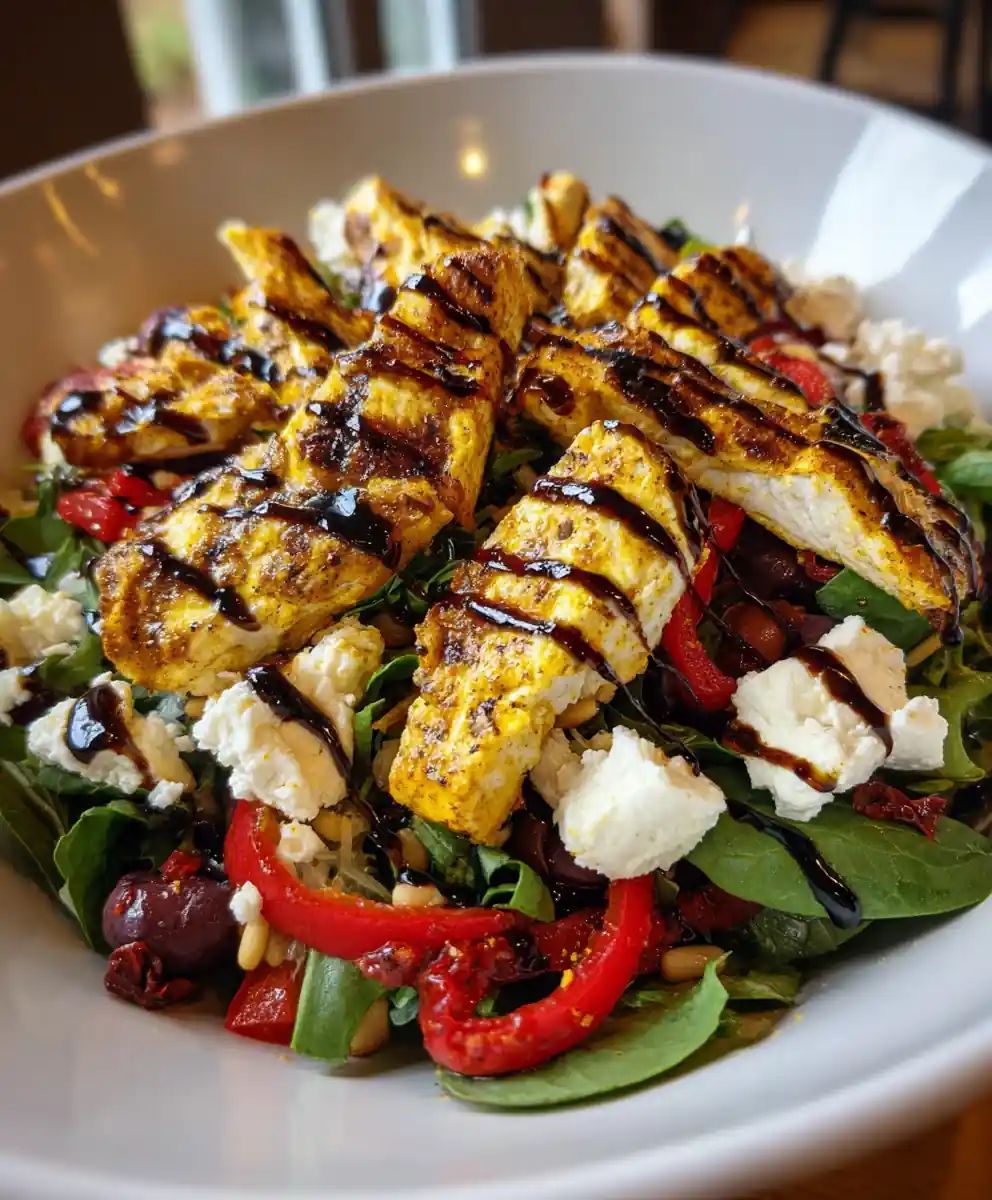 - Assemble Salad: Combine greens, mozzarella, peppers, olives, tomatoes, pine nuts, and chicken. Drizzle with dressing.
