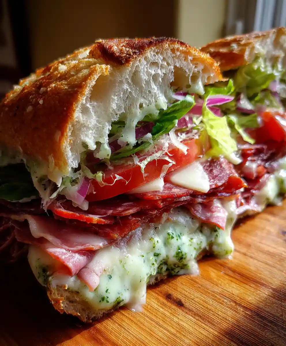 A hearty Italian sub featuring a creamy basil-ricotta spread, layered with cured meats, provolone cheese, and fresh vegetables. This easy recipe makes a satisfying meal perfect for picnics or feeding a crowd.