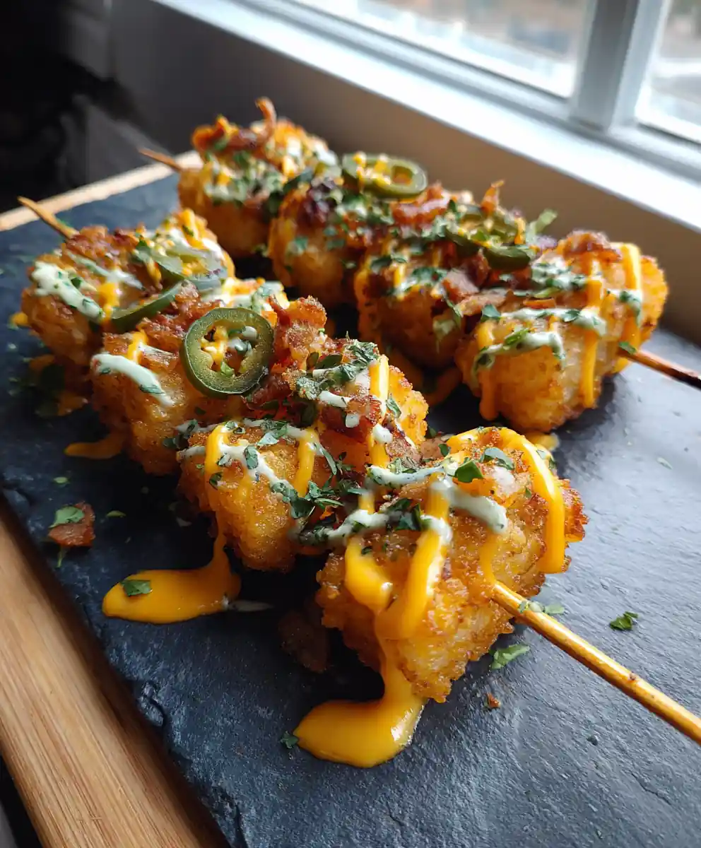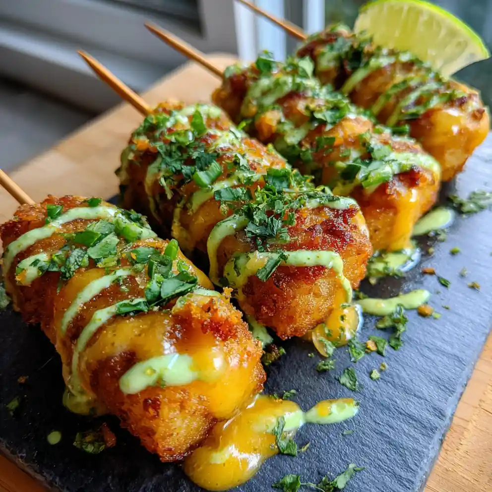 These Jalapeño Cheesy Loaded Tater Tot Skewers are a fun and flavorful appetizer featuring crispy tater tots loaded with a spicy jalapeño-cheddar filling, topped with smoked turkey, and drizzled with a creamy avocado-lime sauce. They’re perfect for parties or a satisfying treat.