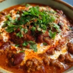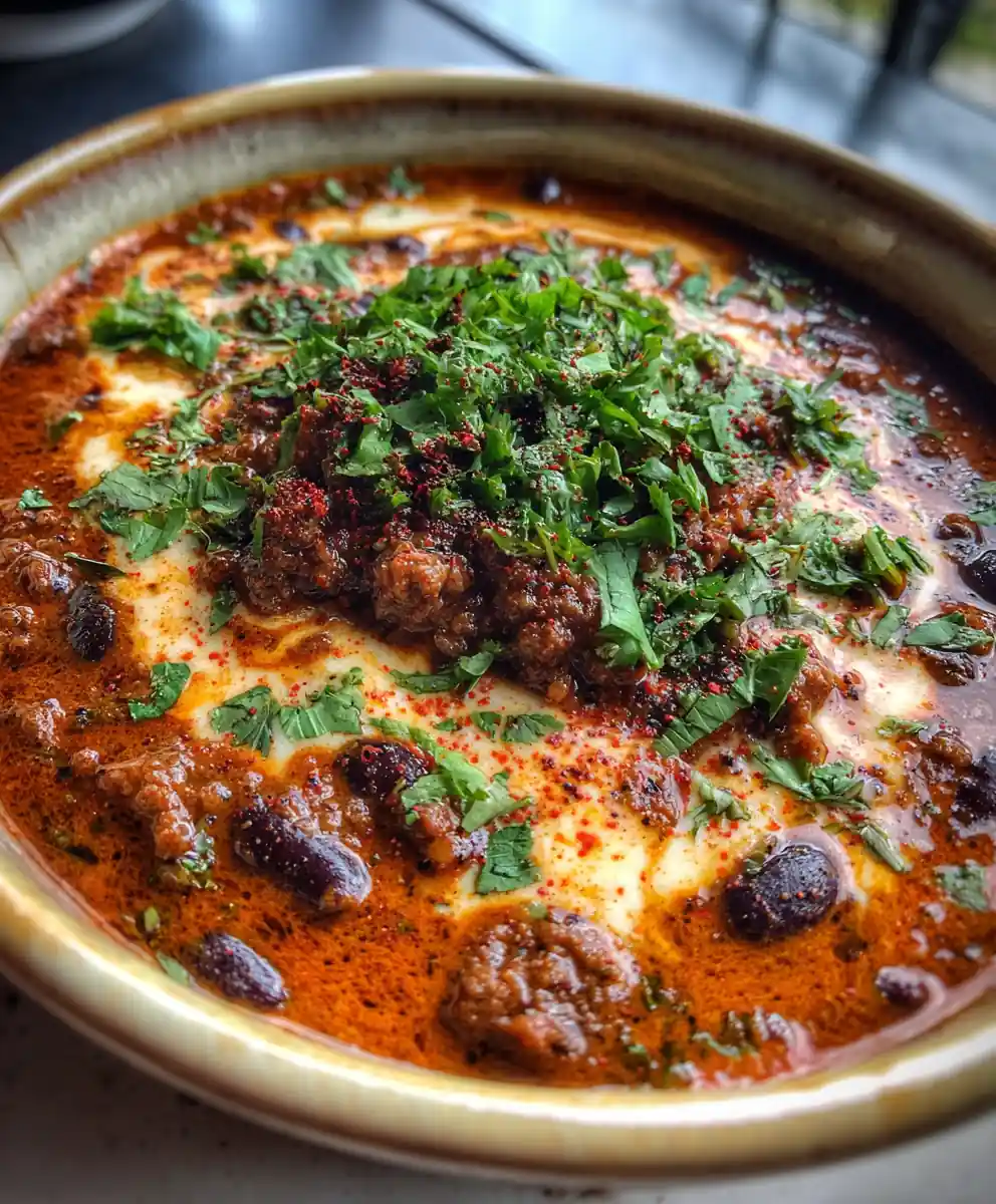 - Serve and Garnish: Ladle the hot lamb chili into deep bowls. Place a generous dollop of the Creamy Smoked Paprika & Roasted Red Pepper Swirl on top of each serving. Create light swirls with a spoon, then garnish generously with fresh chopped cilantro and a light dusting of extra smoked paprika.