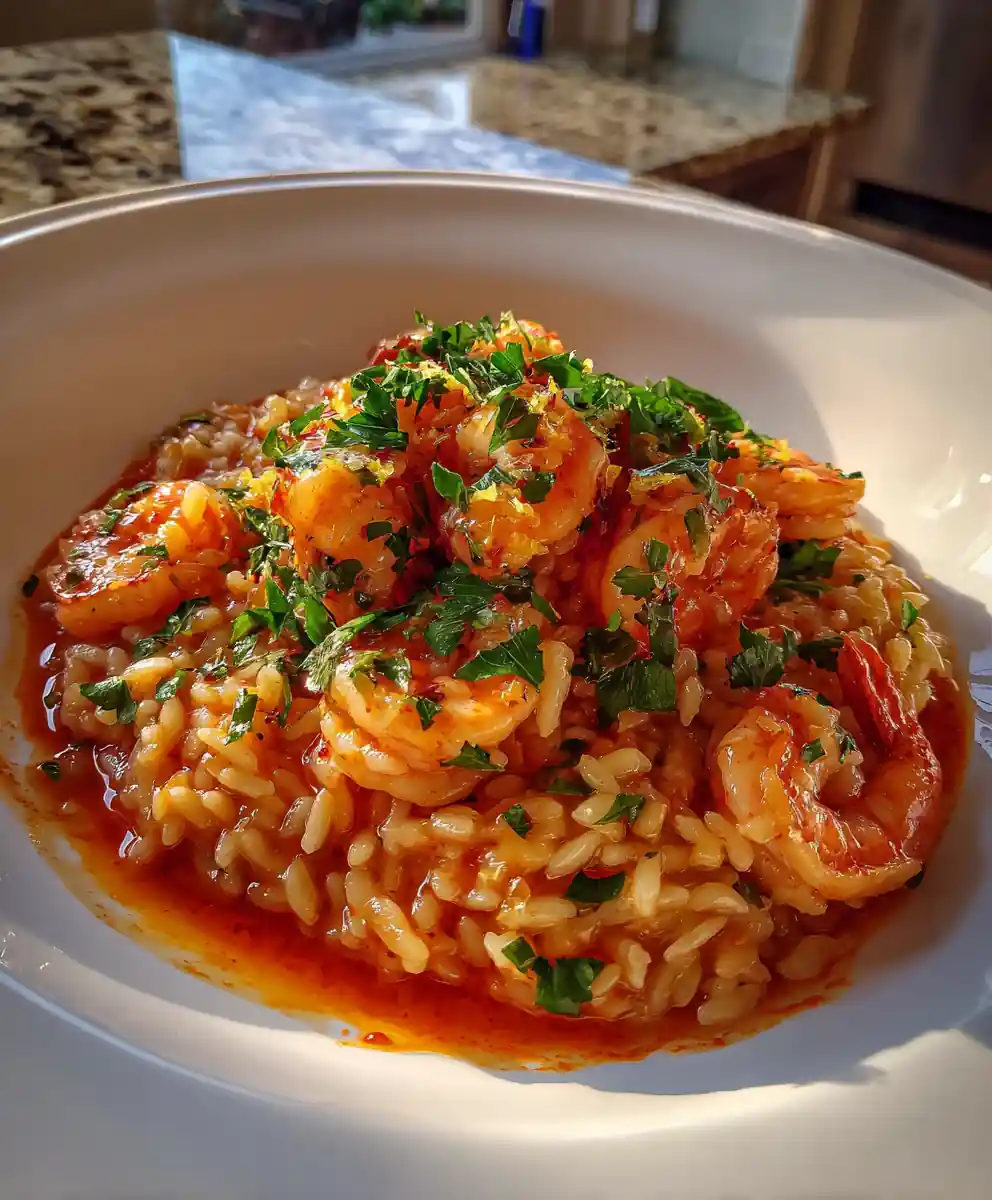 - Plate and Garnish: Plate the Lemon Butter Shrimp Orzo on a wide, white plate. Arrange the shrimp and orzo in a shallow mound. Drizzle any remaining red pepper butter swirl across the top. Garnish generously with chopped fresh parsley and a sprinkle of fresh lemon zest for a pop of color and freshness.