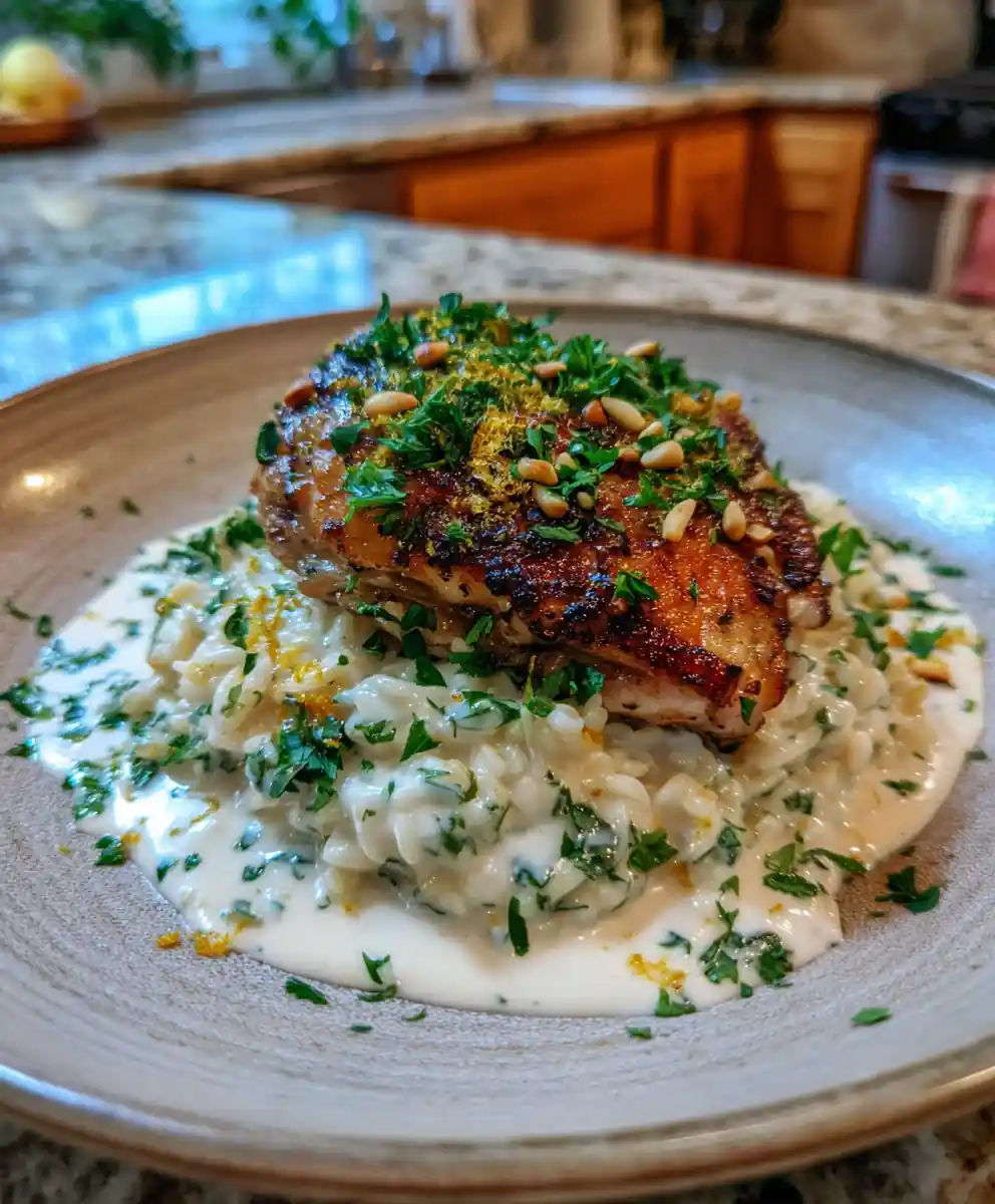 8. Finish and Serve: Remove the cooked chicken pieces from the skillet and place them on a serving platter. Stir half of the lemon-herb yogurt sauce into the cooked orzo, creating creamy ribbons. Plate a generous mound of the creamy orzo, lay the chicken on top, and drizzle the remaining yogurt sauce in a decorative swirl over the chicken and around the plate.