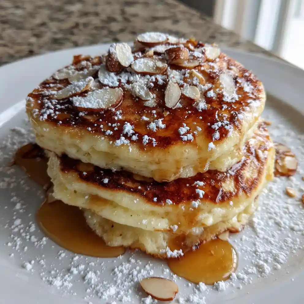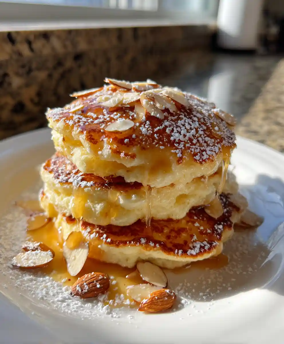 11. Plate and Garnish: Plate 2-3 pancakes, stacked attractively. Drizzle generously with the lemon glaze, sprinkle with toasted almond slivers, and finish with a light dusting of powdered sugar.