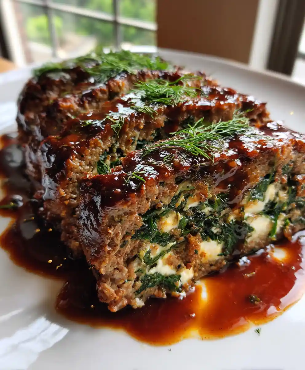 - Rest and Serve: Remove the meatloaf from the oven and let it rest on the baking sheet for 10 minutes before slicing. This allows the juices to redistribute and the loaf to firm up, making for cleaner slices. To serve, transfer the rested meatloaf to a platter. Slice it into thick, even slices, revealing the vibrant green and white spinach and feta center. Drizzle the remaining balsamic glaze over the sliced meatloaf, and garnish generously with chopped fresh dill for a final pop of color and freshness.