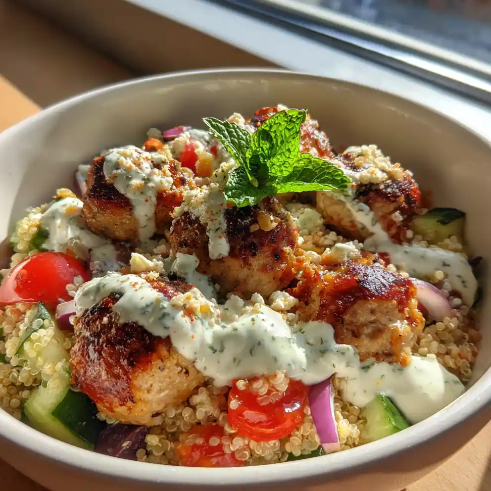 These Mediterranean Chicken Meatball Bowls are a healthy and flavorful meal featuring lean protein, fluffy quinoa, and a zesty lemon-herb yogurt drizzle. Perfect for a weeknight dinner or meal prep, this recipe brings the taste of the Mediterranean to your table.
