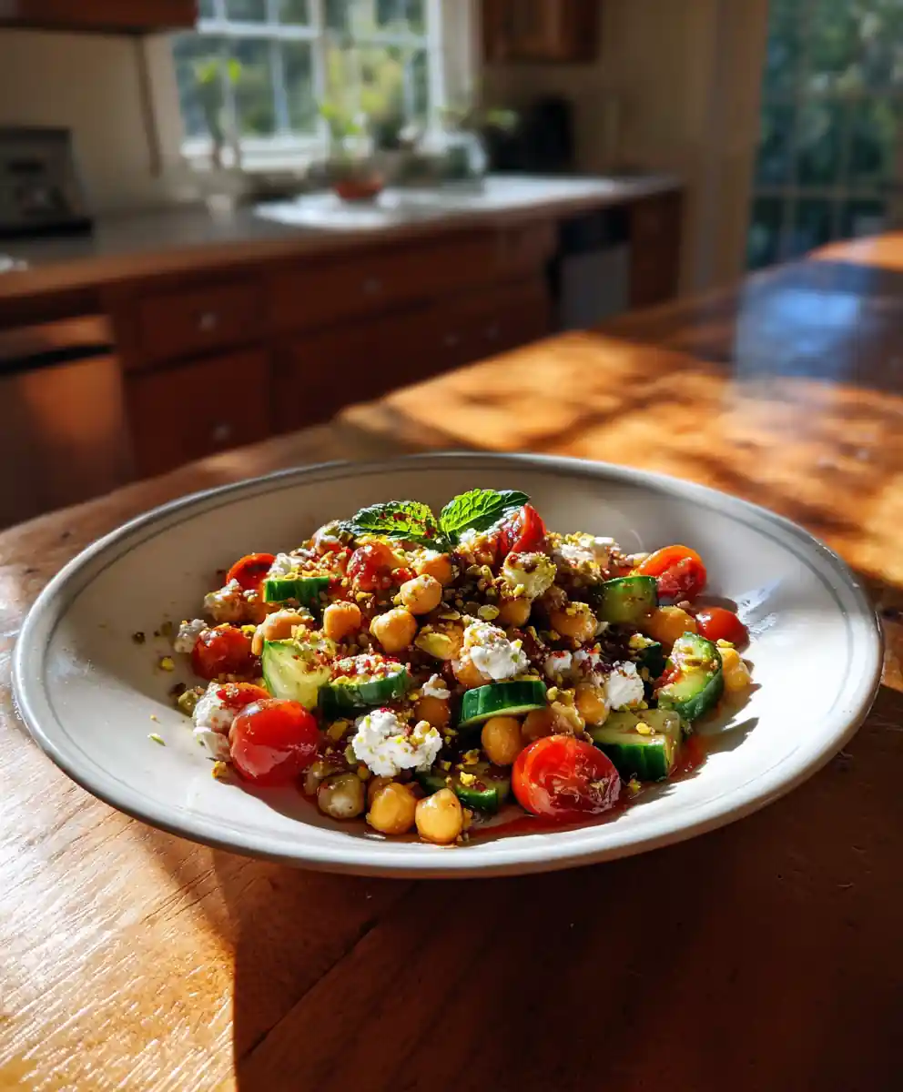 This Mediterranean Chickpea Salad is a vibrant, flavorful, and healthy dish that’s perfect for a light lunch, a side dish, or even a potluck contribution. The combination of textures and flavors โ the creamy chickpeas, the crisp vegetables, the tangy dressing, and the crunchy pistachios โ is simply irresistible. Don’t forget to save this recipe to Pinterest for easy access later! Print