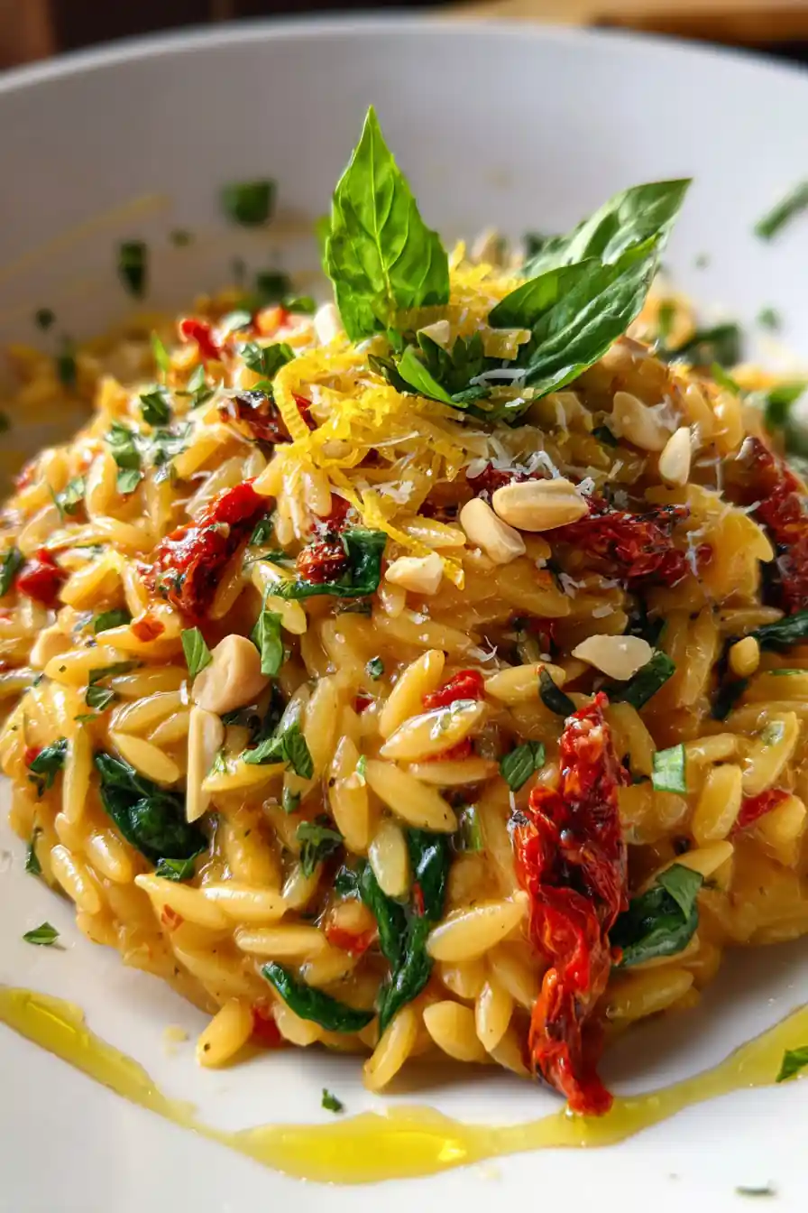 This Creamy Tuscan Orzo is a comforting and flavorful pasta dish inspired by Tuscan cuisine. It features orzo pasta in a creamy sauce with sun-dried tomatoes, spinach, and Parmesan cheese, ready in under 30 minutes.