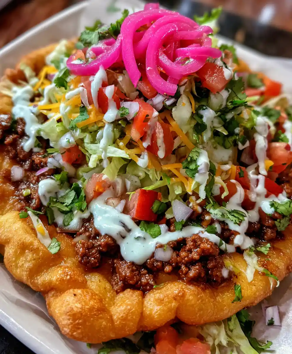 A hearty and satisfying Navajo taco recipe, featuring warm, puffy fry bread with savory beef and fresh toppings, designed for easy weeknight meals or family gatherings. It offers a fun, build-your-own experience that everyone loves.