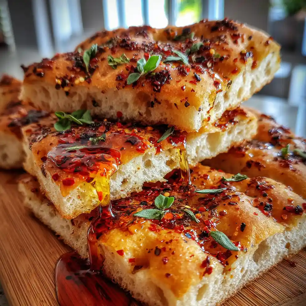 An easy no-knead focaccia recipe featuring an overnight cold proof for maximum flavor and a beautifully airy crumb. It is finished with a unique spicy honey drizzle and fresh herbs for a gourmet twist.