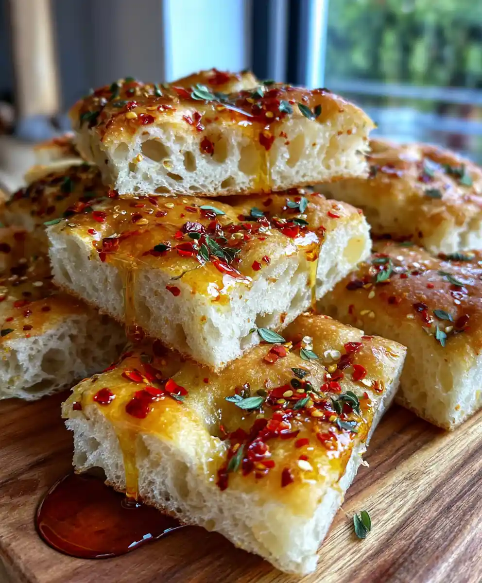 5. Bake and Glaze: Bake the focaccia for 20-30 minutes, or until deeply golden brown on top and cooked through. The internal temperature should reach 200ยฐF (93ยฐC) for perfect doneness. While the focaccia bakes, prepare the hot honey drizzle by warming the honey and red pepper flakes in a small saucepan over low heat until runny.