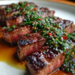 This recipe features a perfectly seared NY strip steak with a beautiful charred crust, complemented by vibrant homemade chimichurri. It’s a high-protein, family-friendly meal that brings a restaurant-worthy experience to your home.