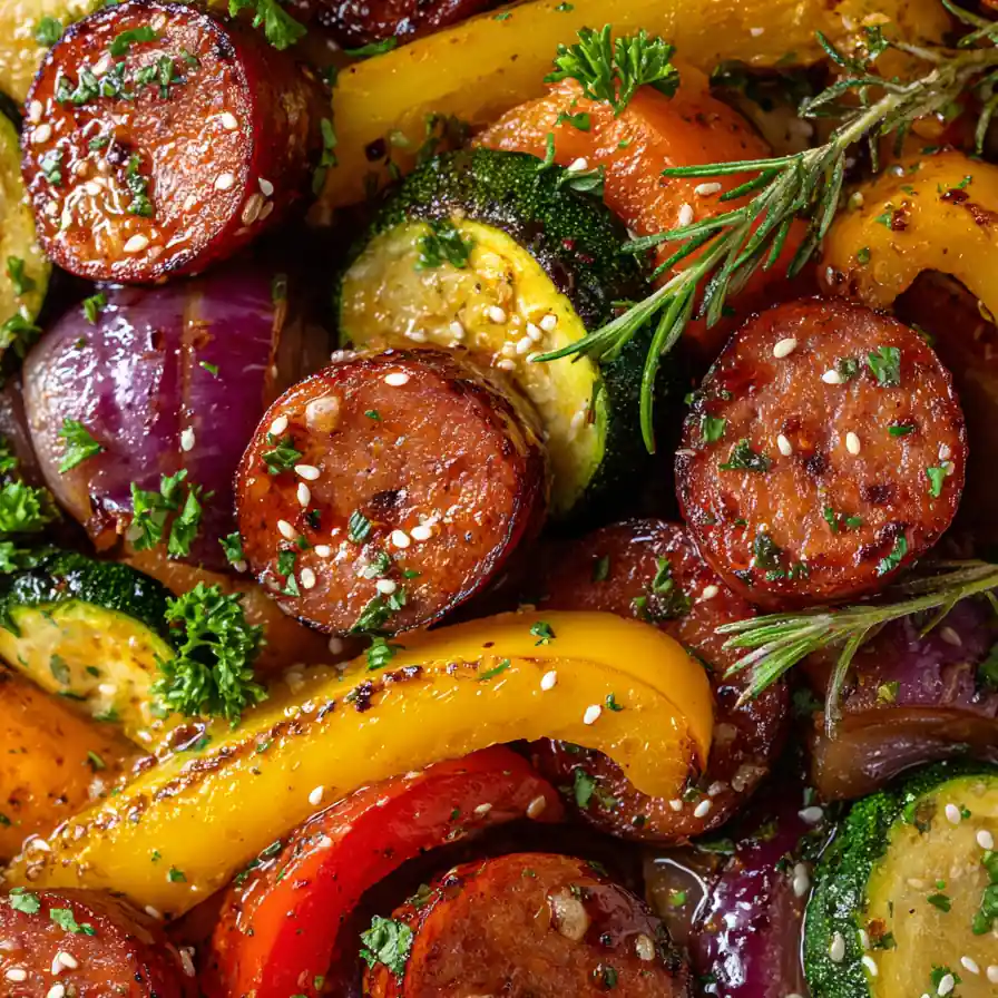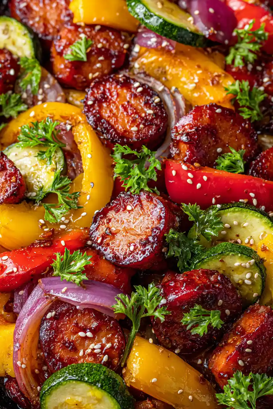 - Rest, Garnish, and Serve: Remove the baking sheet from the oven and let the kielbasa and veggies rest for 5 minutes. This allows the flavors to settle. Transfer the contents to a serving platter, arranging the kielbasa slices and vegetables attractively. Drizzle any remaining glaze over the top, sprinkle with chopped fresh parsley and toasted sesame seeds, and serve immediately.