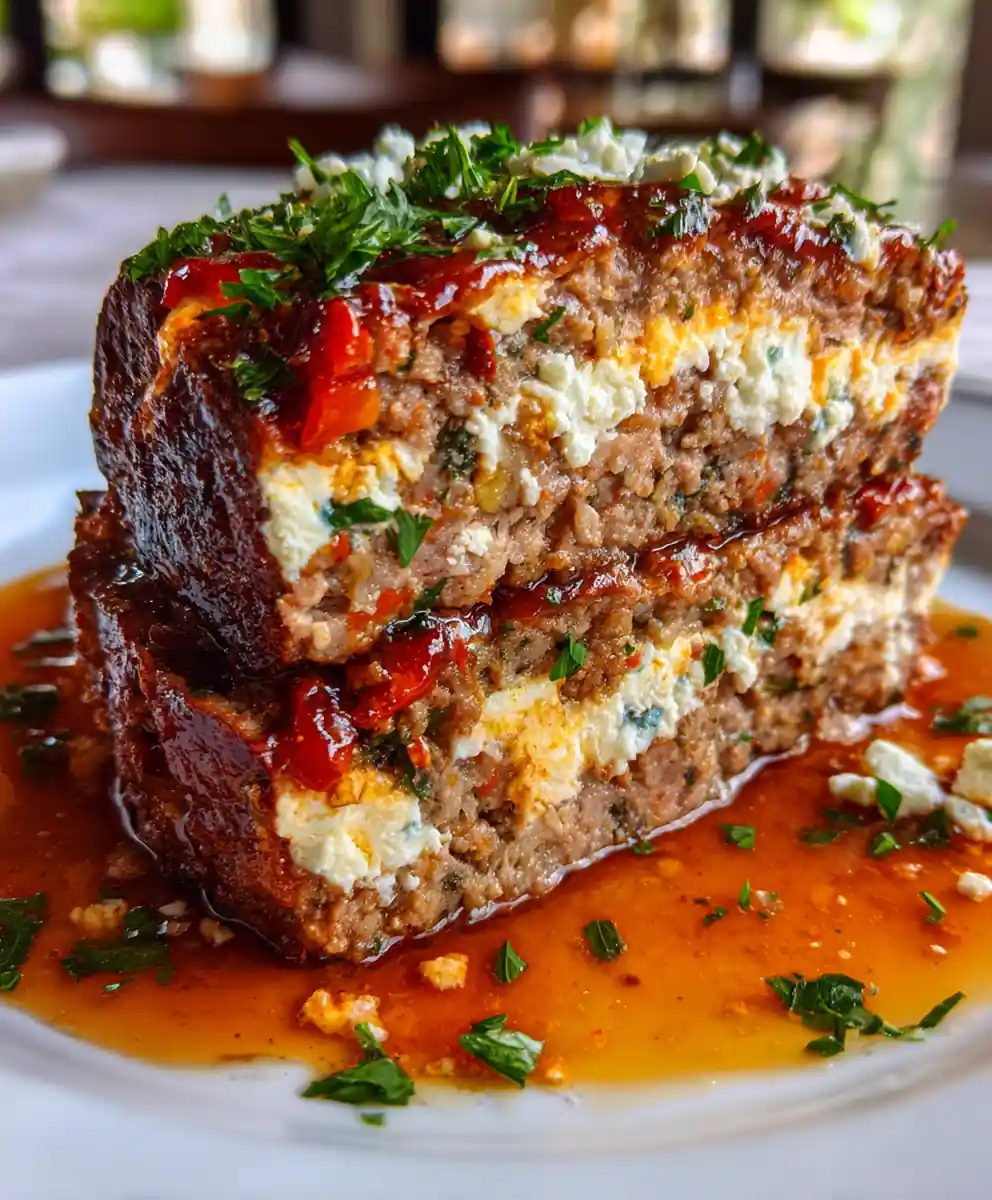 4. Layer and Shape Loaf: Place half of the meat mixture onto the prepared baking sheet and pat it into a rectangle. Spread the pepper and feta filling over the meat, leaving a small border. Place the remaining meat mixture on top of the filling, carefully sealing the edges to enclose the filling. Shape into a neat loaf.