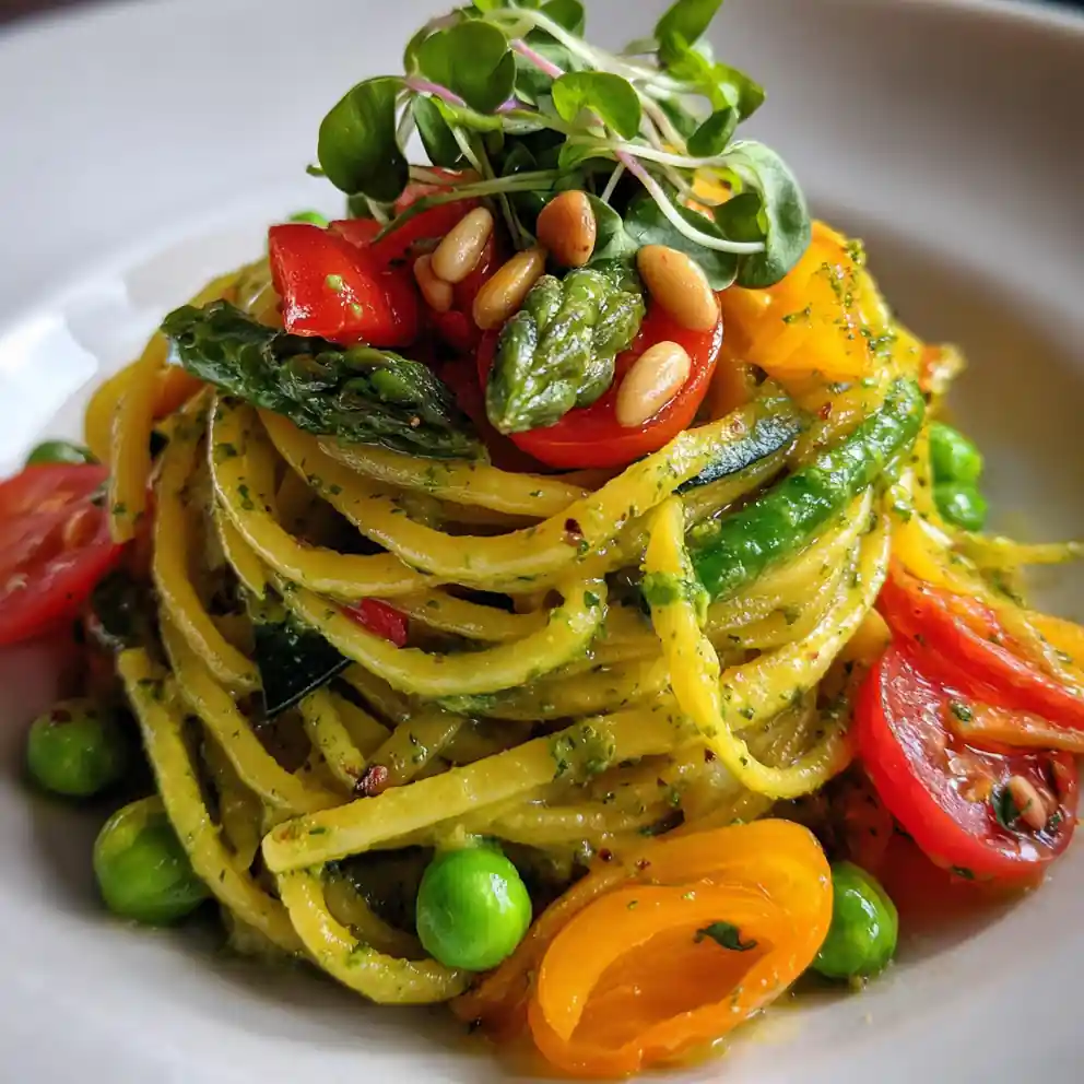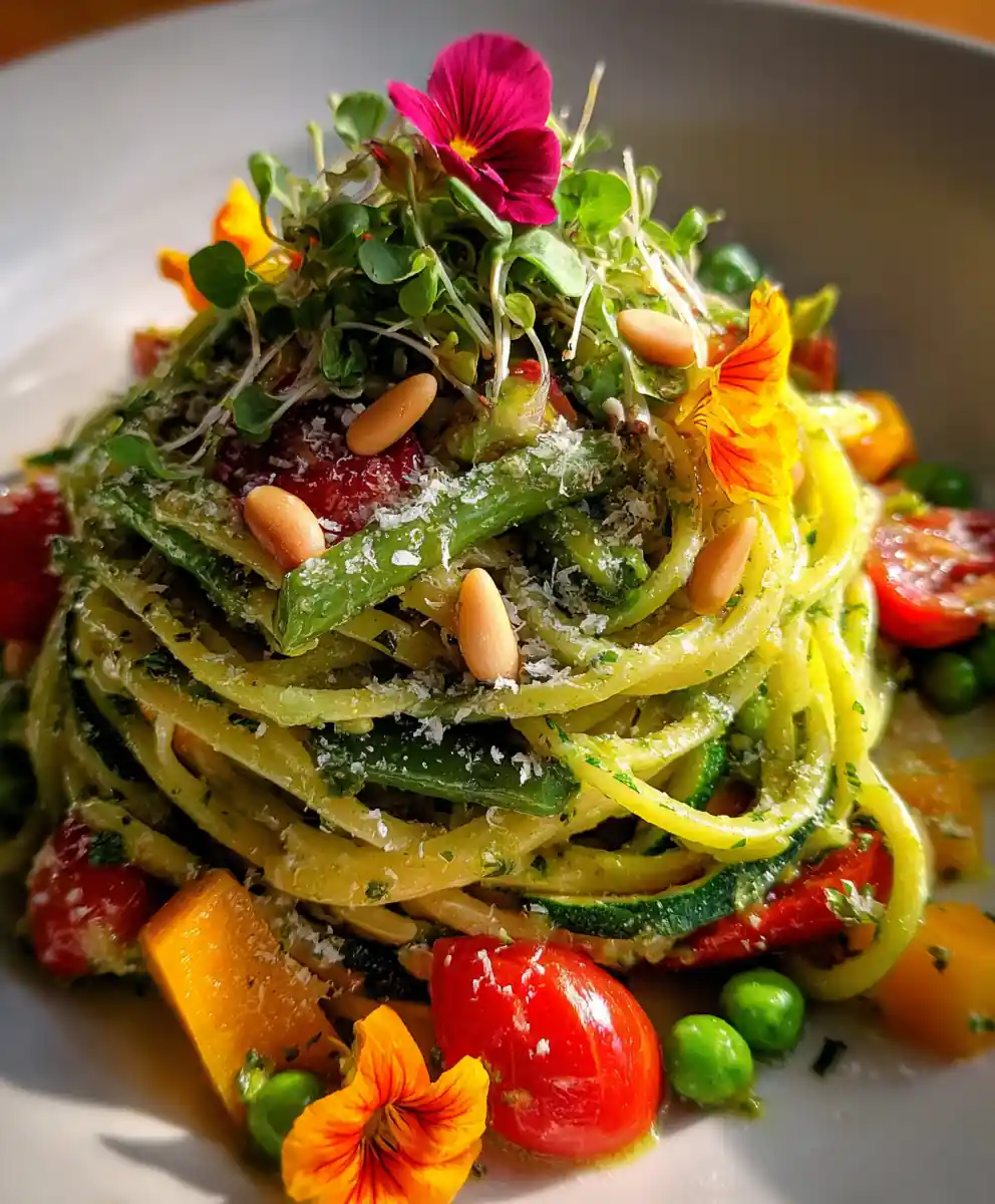 - Plate and Garnish: Plate the Pasta Primavera on a wide, white ceramic plate. Twirl a generous mound of pasta in the center. Drizzle the chili-infused olive oil in a thin spiral around the base. Sprinkle with extra pine nuts, a few shavings of Parmesan cheese, and a vibrant mix of microgreens. Finally, add a handful of nasturtium petals for a pop of color and a peppery finish. Let the pasta rest for 2 minutes before serving.
