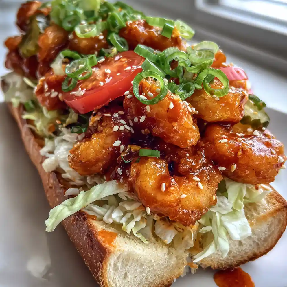 A crispy shrimp po boy sandwich featuring a sweet and spicy gochujang honey aioli, perfect for an easy weeknight meal. The double-dredging technique ensures a super-crispy crust on the shrimp, complemented by fresh toppings and a tangy aioli.
