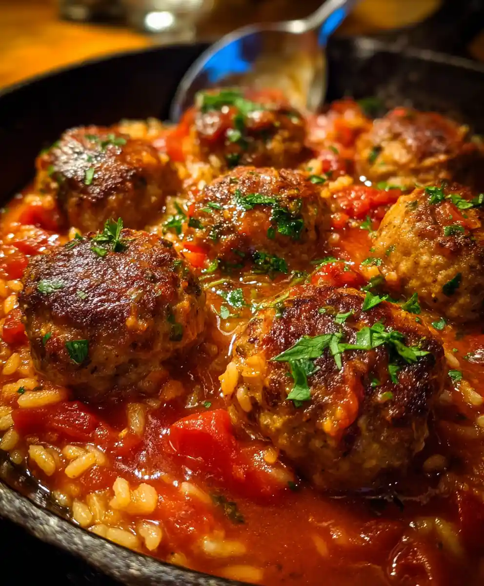 Tender, rice-infused meatballs are simmered in a rich, slow-cooked roasted tomato sauce, perfect for a comforting and easy family dinner.