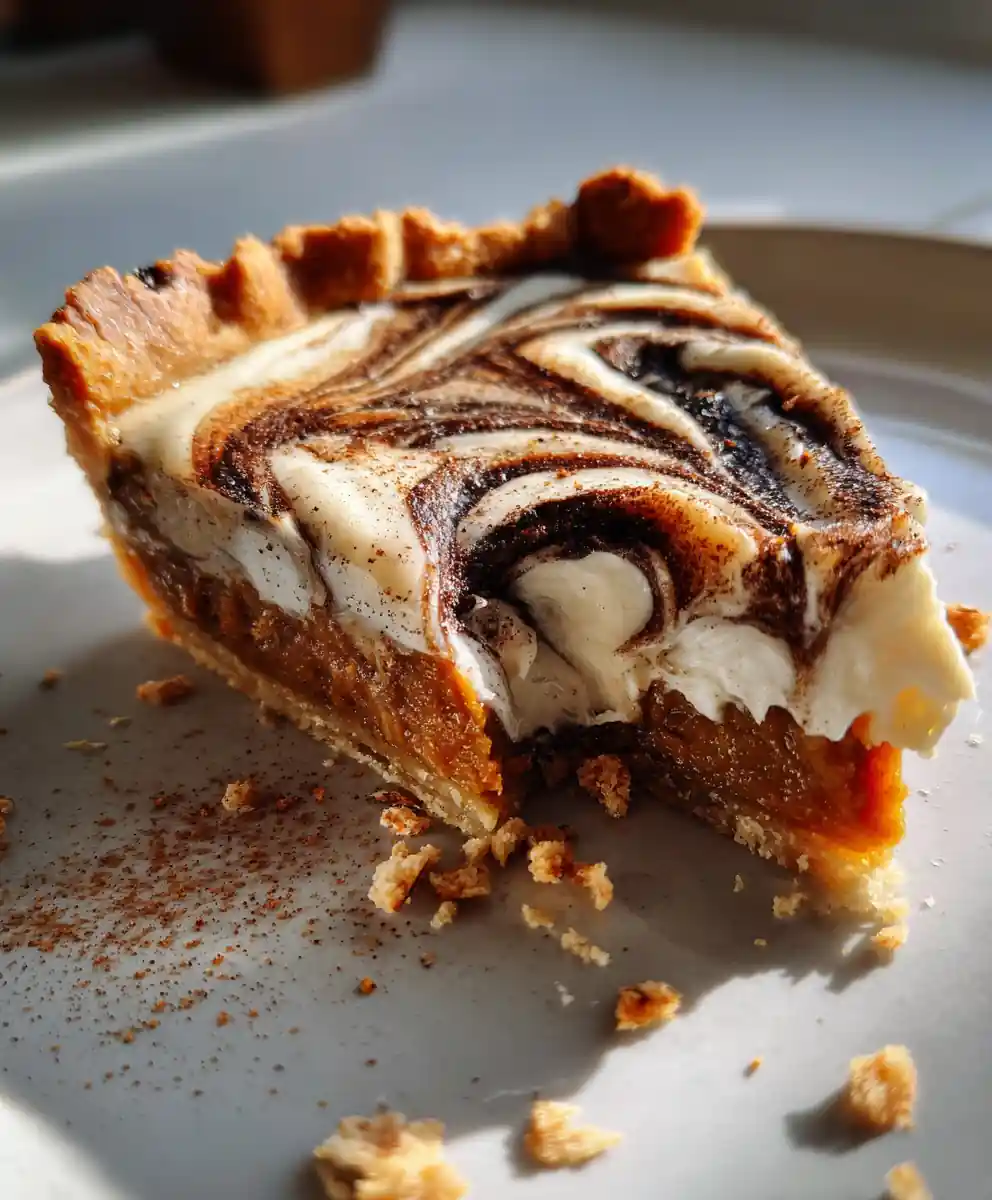 Cut the cooled pie with a sharp knife, wiping the knife clean between cuts for a neat presentation that showcases the swirl. Serve individual slices on a simple plate to highlight the contrasting colors of the swirl. Lightly dust the top of the slice with a pinch of the prepared chai spice blend to enhance the visual appeal and aroma, creating a high-quality, family-friendly dessert from this pumpkin pie recipe minecraft.