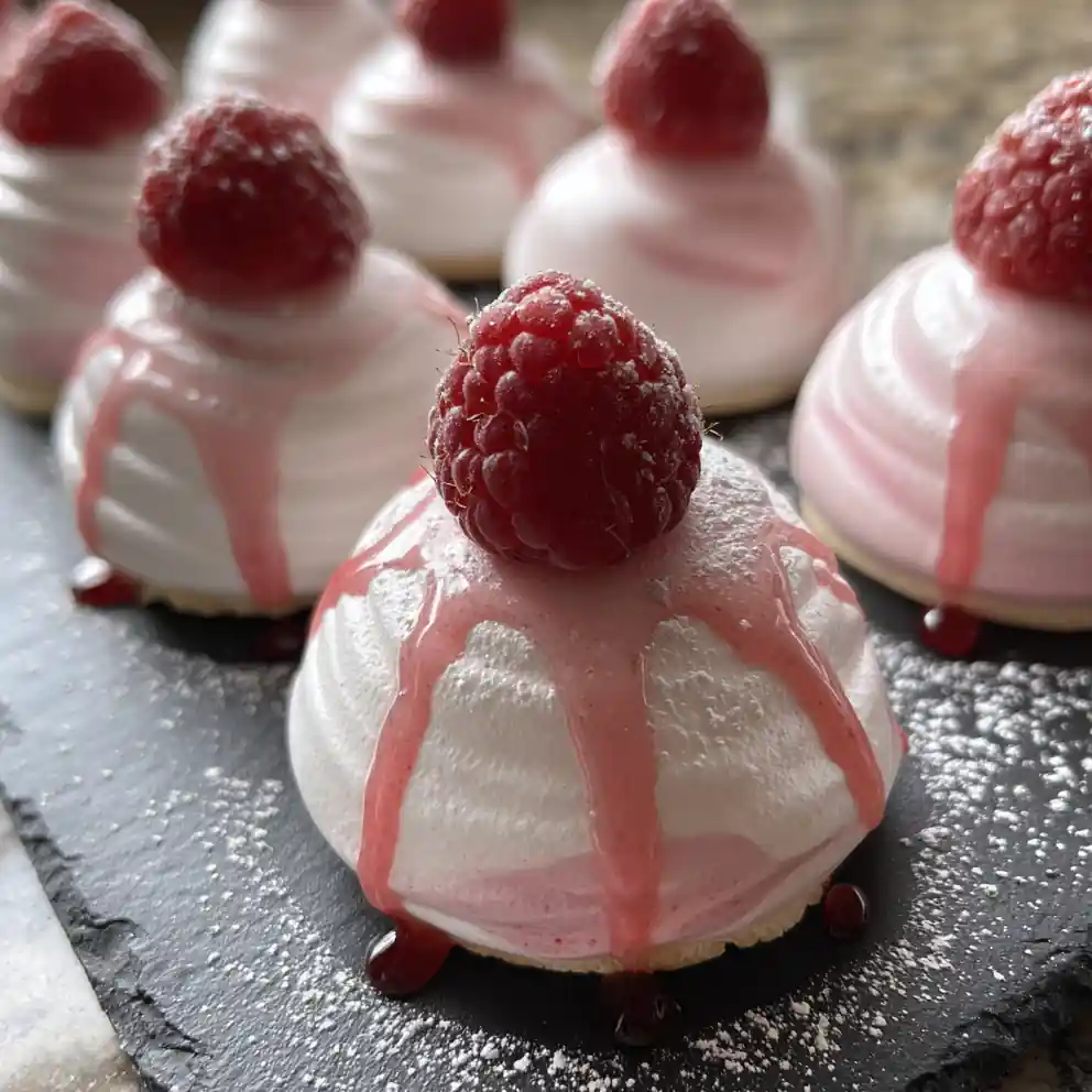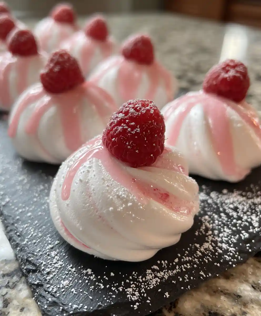 - Plate and Garnish: To serve, arrange the Raspberry Swirl Jello Meringue Cookies on a white plate. Drizzle a thin line of remaining raspberry puree across each cookie, dust lightly with powdered sugar, and top with a fresh raspberry half for a beautiful contrast of color and flavor.