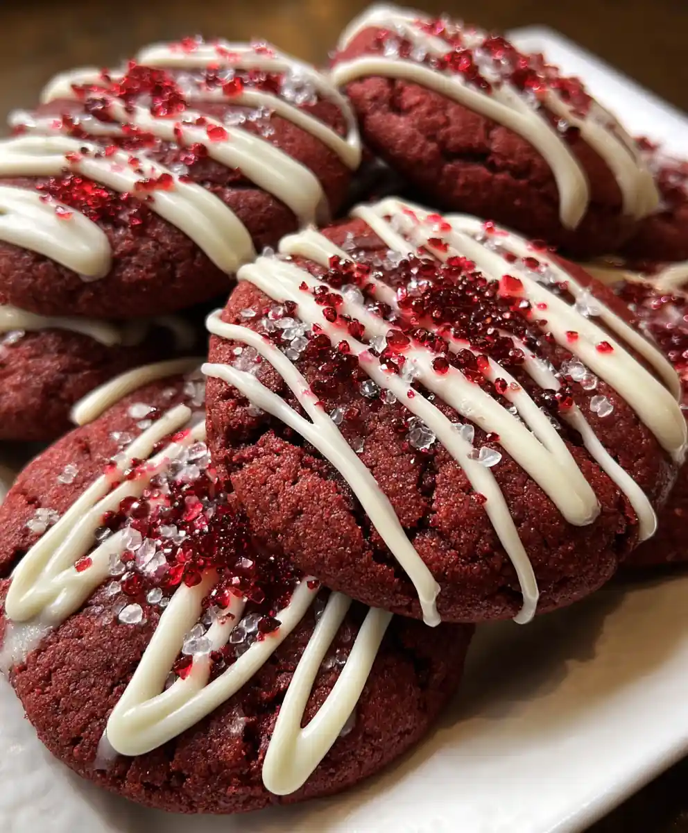 Red Velvet Cookies Recipe White Chocolate Drizzle And Ruby Crystals 1761849559.415766