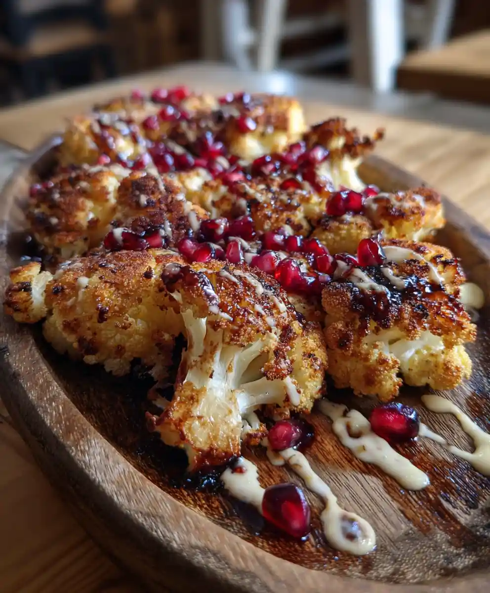 - Drizzle and Serve: Arrange the hot roasted cauliflower on a serving platter. Generously drizzle with the prepared Tahini Pomegranate Drip.