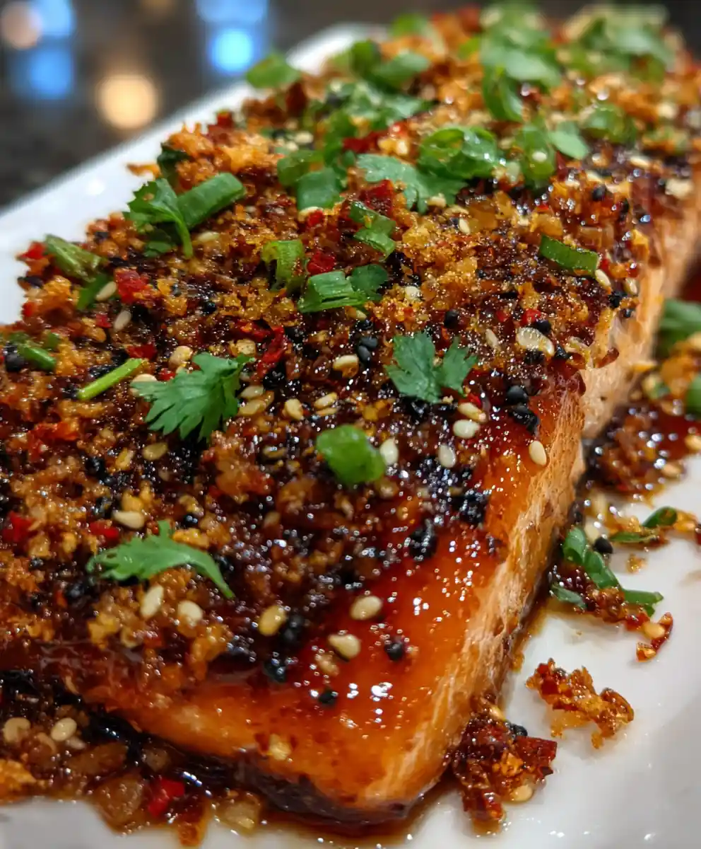 Pat the salmon fillets thoroughly dry with paper towels; this helps them get a better sear and keeps the flesh tender. Rub each fillet with olive oil, then season generously with salt and freshly ground black pepper on both sides for foundational flavor. In a small bowl, whisk together the white miso paste, maple syrup, rice vinegar, water, and toasted sesame oil until perfectly smooth โ this becomes your beautiful, glossy glaze. Next, in another small, dry pan over medium-low heat, gently toast the white and black sesame seeds for 2-3 minutes until they become fragrant and lightly golden. Transfer them to a small bowl and mix with the red chili flakes and crushed crispy fried shallots to create your vibrant chili-sesame crumble.
