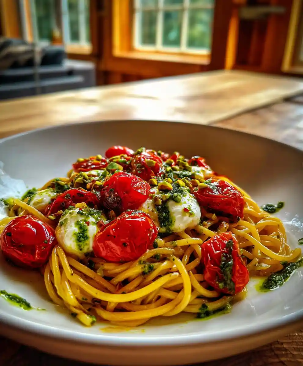 This Roasted Tomato Garlic Pasta features sweet roasted tomatoes, fragrant garlic, and a creamy pistachio-basil ricotta swirl, tossed with spaghetti for a restaurant-quality meal. It’s an easy recipe that delivers impressive flavor.