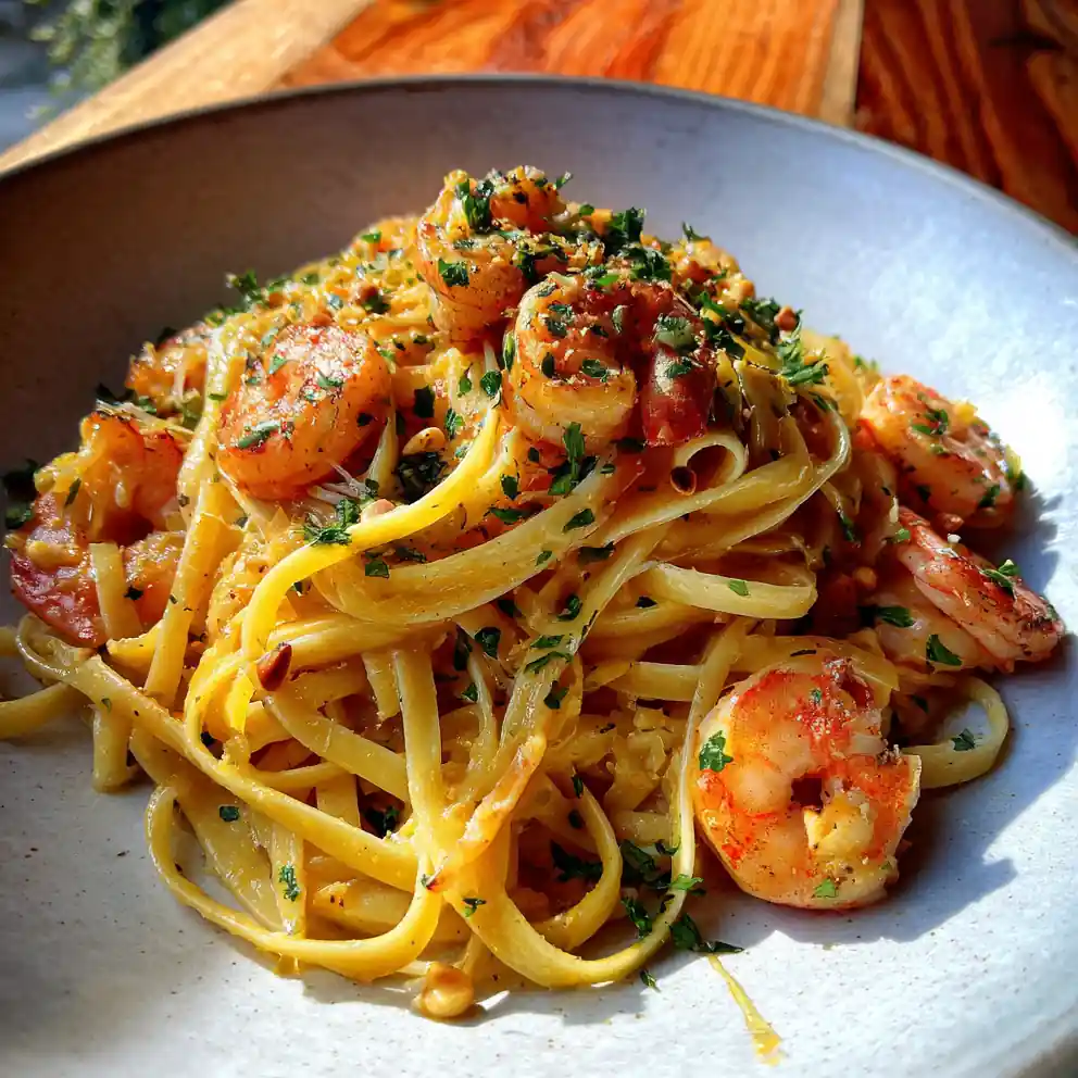 - Combine Pasta and Sauce: Add the cooked linguine to the skillet with the shrimp and sauce. Add a splash of the reserved pasta water โ start with a tablespoon or two and add more as needed. Toss vigorously until the pasta is evenly coated with the saffron butter sauce, creating beautiful golden ribbons. The pasta water helps create an emulsified, glossy sauce that clings to the linguine.