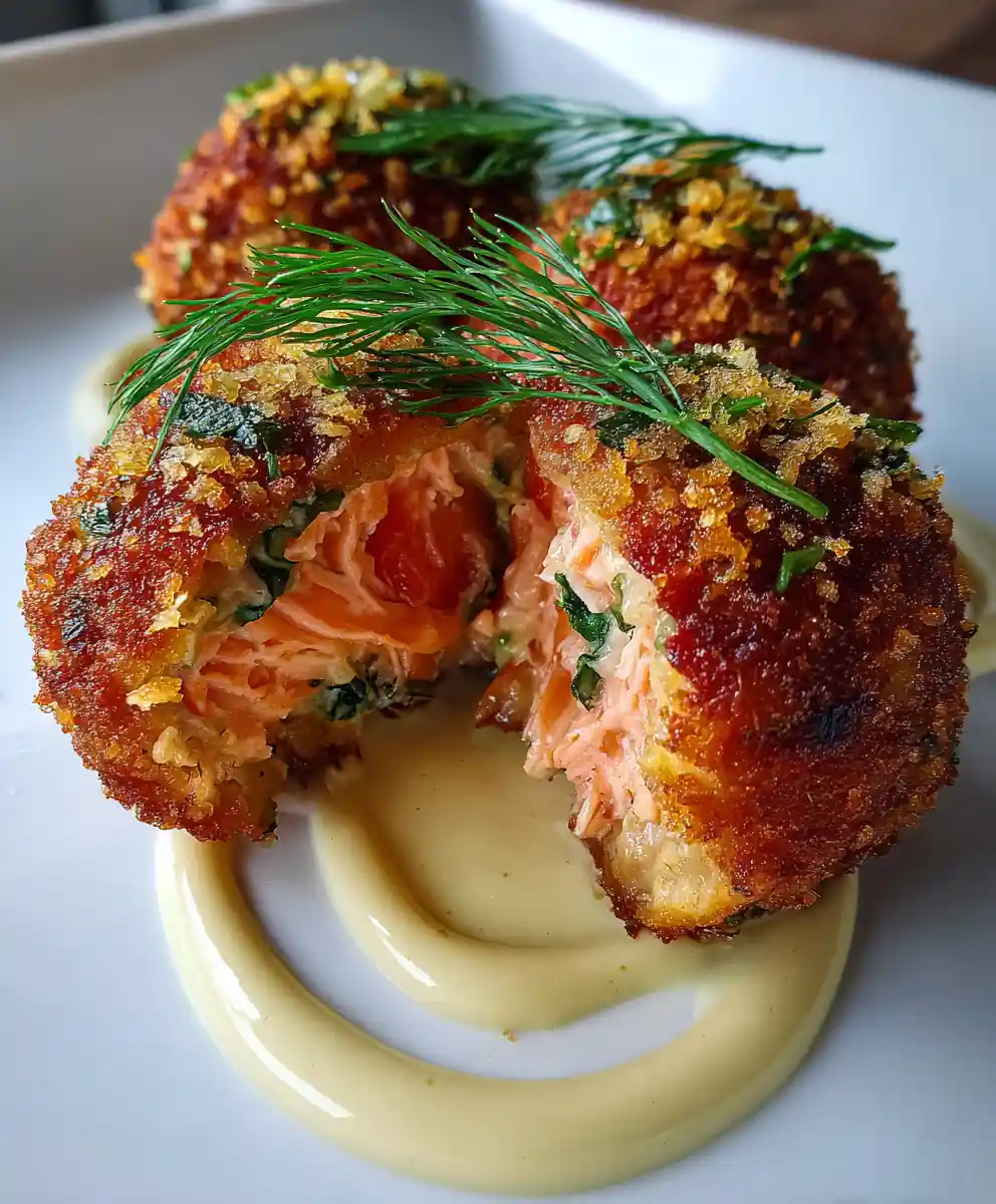 - Drain & Serve: Remove croquettes and drain on a wire rack. Serve immediately for best crispiness. Drizzle with tahini sauce, sprinkle crumble, and garnish. This salmon croquette recipe is ready!