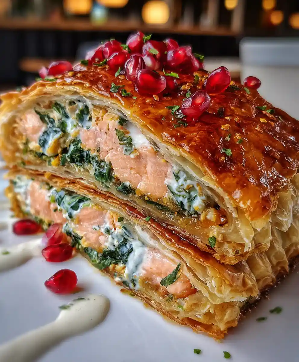 Squeeze excess liquid from spinach to prevent soggy pastry. Resting the salmon en croute after baking is crucial for perfect slices. Consider plant-based feta or gluten-free puff pastry for dietary adjustments. Serve with plain unsweetened yogurt mixed with fresh mint, cilantro, and pomegranate arils for garnish.