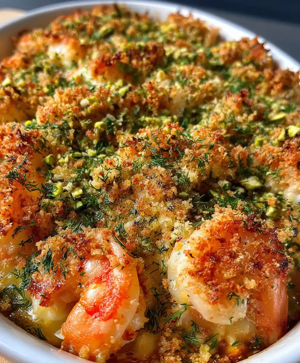 5. Assemble & Bake: Arrange shrimp in a 9×13-inch baking dish. Pour liquid, then evenly top with crumbs. Bake at 390F for 15-20 min; shrimp opaque, topping golden.