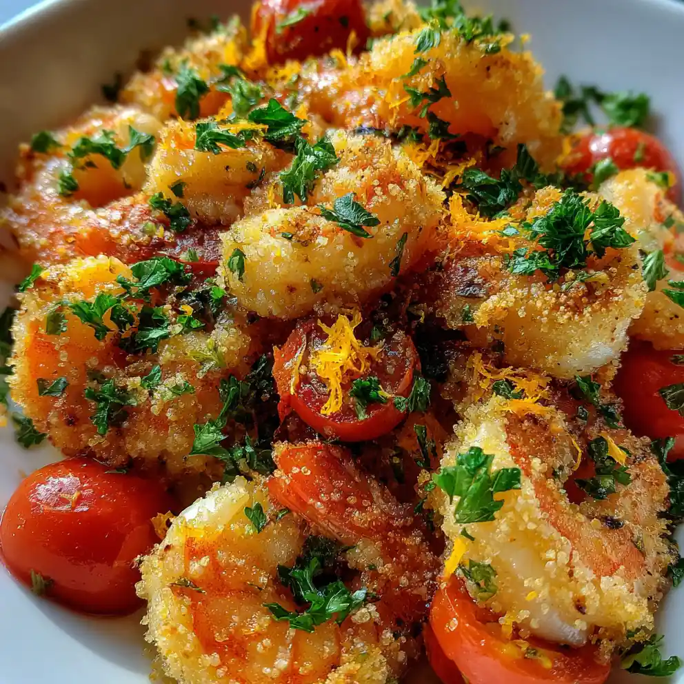 4. Assemble and Bake: Evenly sprinkle the seasoned Panko breadcrumb mixture over the shrimp and tomatoes, ensuring good coverage. Bake for 12-15 minutes, or until the shrimp are pink and opaque, the cherry tomatoes have slightly burst, and the breadcrumb topping is golden brown and crisp.