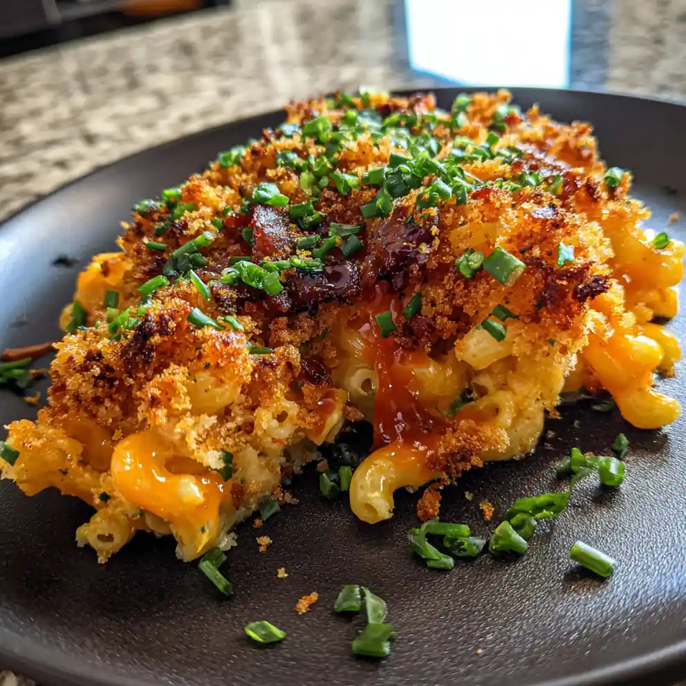 - Rest, Garnish, and Serve: Remove the mac and cheese from the oven and let it rest for 5 minutes before serving. This allows the sauce to set slightly. Drizzle any remaining chipotle-infused cheese sauce over the center, then scatter the chopped fresh chives over the top for a fresh, vibrant garnish. Serve hot.