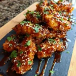 9. Glaze and Garnish: Arrange the baked chicken tenders on a serving plate. Drizzle the warm sesame caramel glaze generously over each piece, allowing some to pool on the plate for a beautiful presentation. Sprinkle with extra toasted sesame seeds and chopped cilantro or scallions.