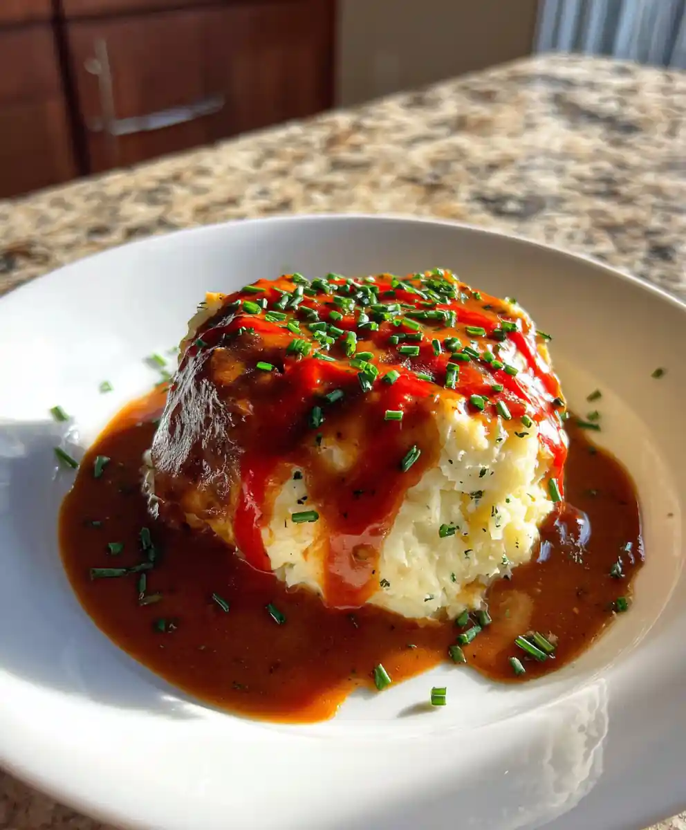 - Plate and Garnish: Serve gravy over mashed potatoes, drizzle with remaining puree, and garnish with chives.