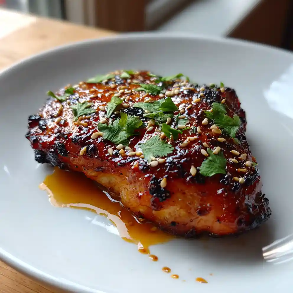 - Plate and Garnish: Plate the chicken thighs on a white or light-colored plate to make the colors pop. Spoon a thin ribbon of glaze across the center of the plate, and finish with a sprinkle of toasted sesame seeds and chopped fresh cilantro for added texture, flavor, and visual appeal.