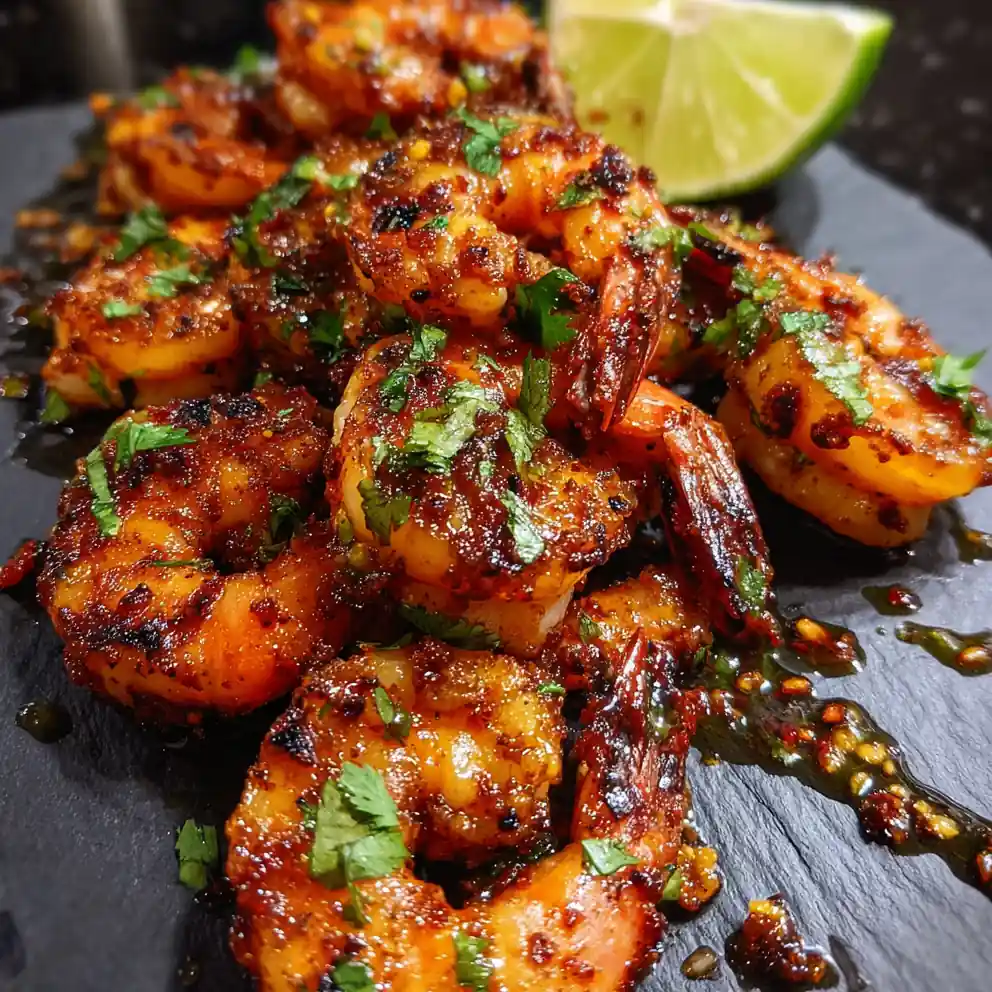 - Assemble and Serve: Arrange the grilled shrimp on a serving platter. Drizzle any remaining glaze over the shrimp for extra flavor and shine. Generously scatter the charred corn crumble over the shrimp. Garnish with chopped cilantro and a few whole cilantro leaves for a pop of color. Serve immediately with optional lime wedges.