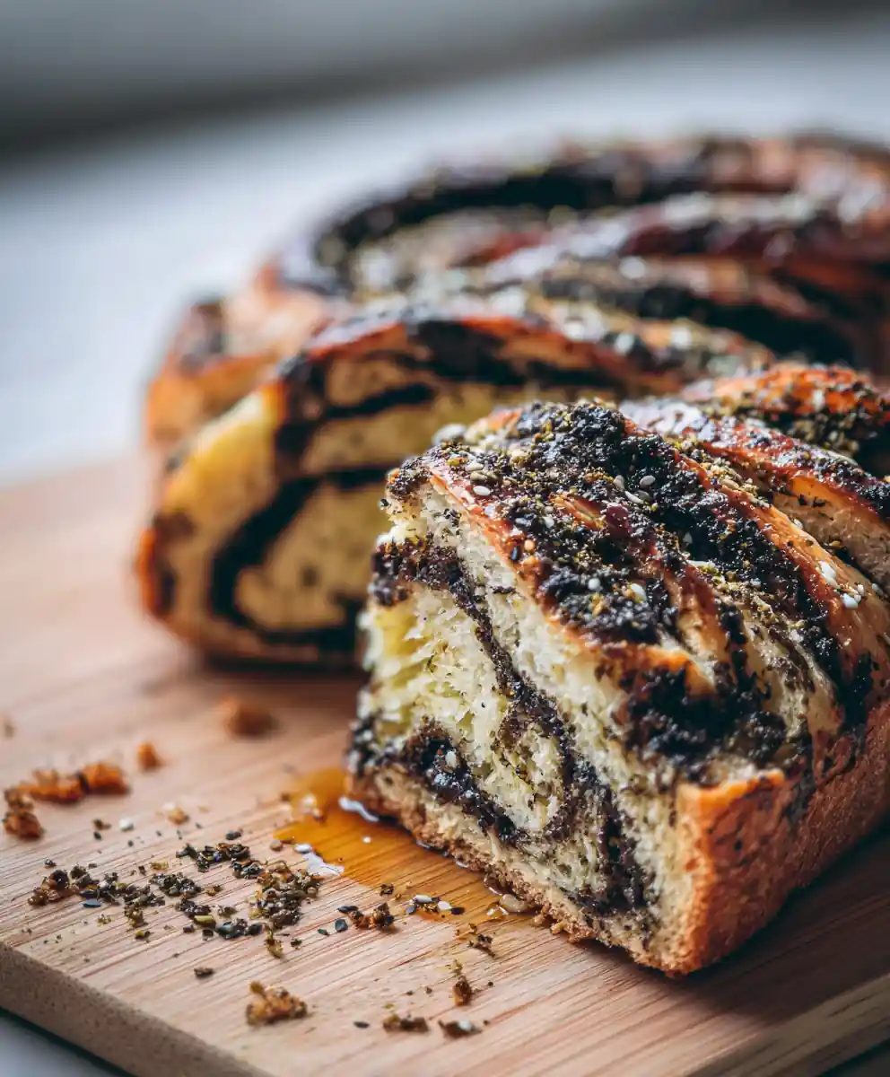 - Shape Loaf: Gently punch down the dough and roll it into a large rectangle (approx. 12×16 inches). Spread the olive-za’atar filling evenly over the surface. Tightly roll the dough into a log starting from a long side, pinching the seam firmly to seal.