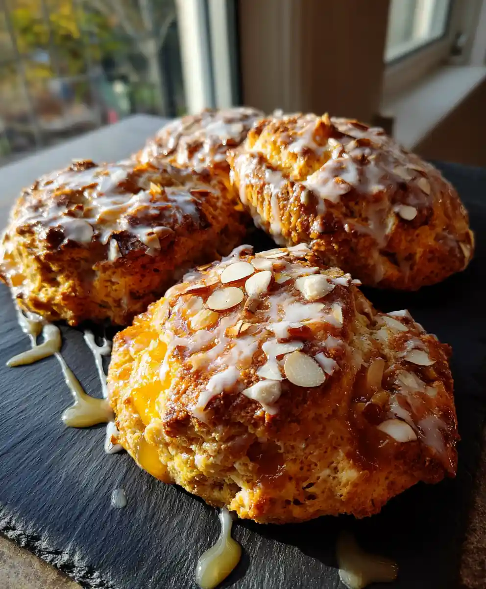 - Final Touches: While the scones are still warm, brush them with a second light coat of honey glaze. Dust generously with powdered sugar and sprinkle with toasted almond slivers.