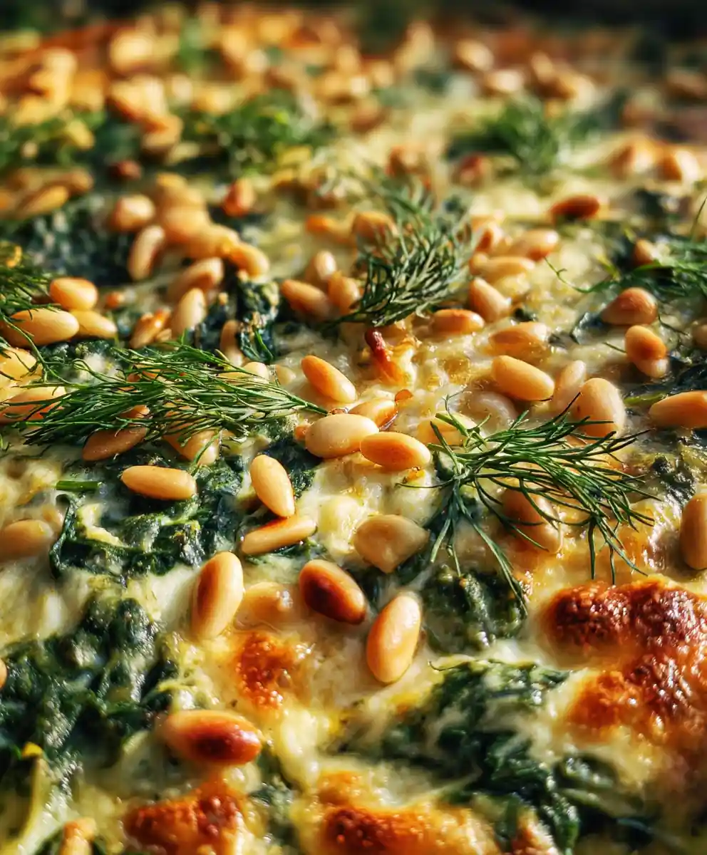 - Rest and Garnish: Let the casserole rest for 5-10 minutes before serving. Garnish each portion with toasted pine nuts, fresh dill, and a light dusting of lemon zest for a beautiful finish.