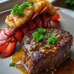 - Finish Cooking and Broil Lobster: Transfer the skillet containing the seared steaks to the preheated oven. Cook for 5-8 minutes for medium-rare (125-130°F internal temperature). At approximately the 3-minute mark, place the prepared lobster tails on a separate baking sheet and broil for 5-7 minutes until the meat is opaque and slightly firm.