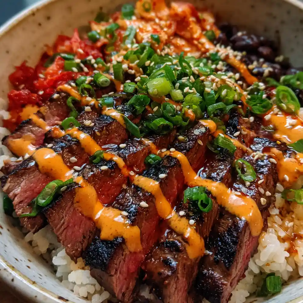 - Assemble Your Bowls: Divide the fluffed jasmine rice among four individual bowls. Arrange sliced steak, seasoned black beans, and kimchi relish neatly over the rice. Drizzle the Gochujang-Lime Crema in a zigzag pattern over all components. Garnish generously with toasted sesame seeds and thinly sliced spring onions. Serve immediately.
