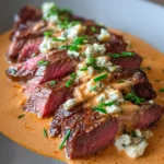 6. Slice and Serve (2 minutes): Slice the rested steaks against the grain into thick, even pieces. Arrange the fanned slices of steak on warm plates. Spoon a generous pool of the vibrant Smoked Red Pepper Gorgonzola sauce alongside or gently over the steak slices. Garnish lightly with finely chopped fresh chives for a fresh finish. This complete steak gorgonzola recipe is truly a crowd-pleaser. Using a meat thermometer to check for 130-135ยฐF ensures perfect medium-rare doneness every time.