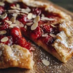 7. Garnish and Serve: Serve the cooled strawberry galette. Dust generously with powdered sugar over the crust and fruit. Scatter toasted slivered almonds over the top for crunch and visual appeal.