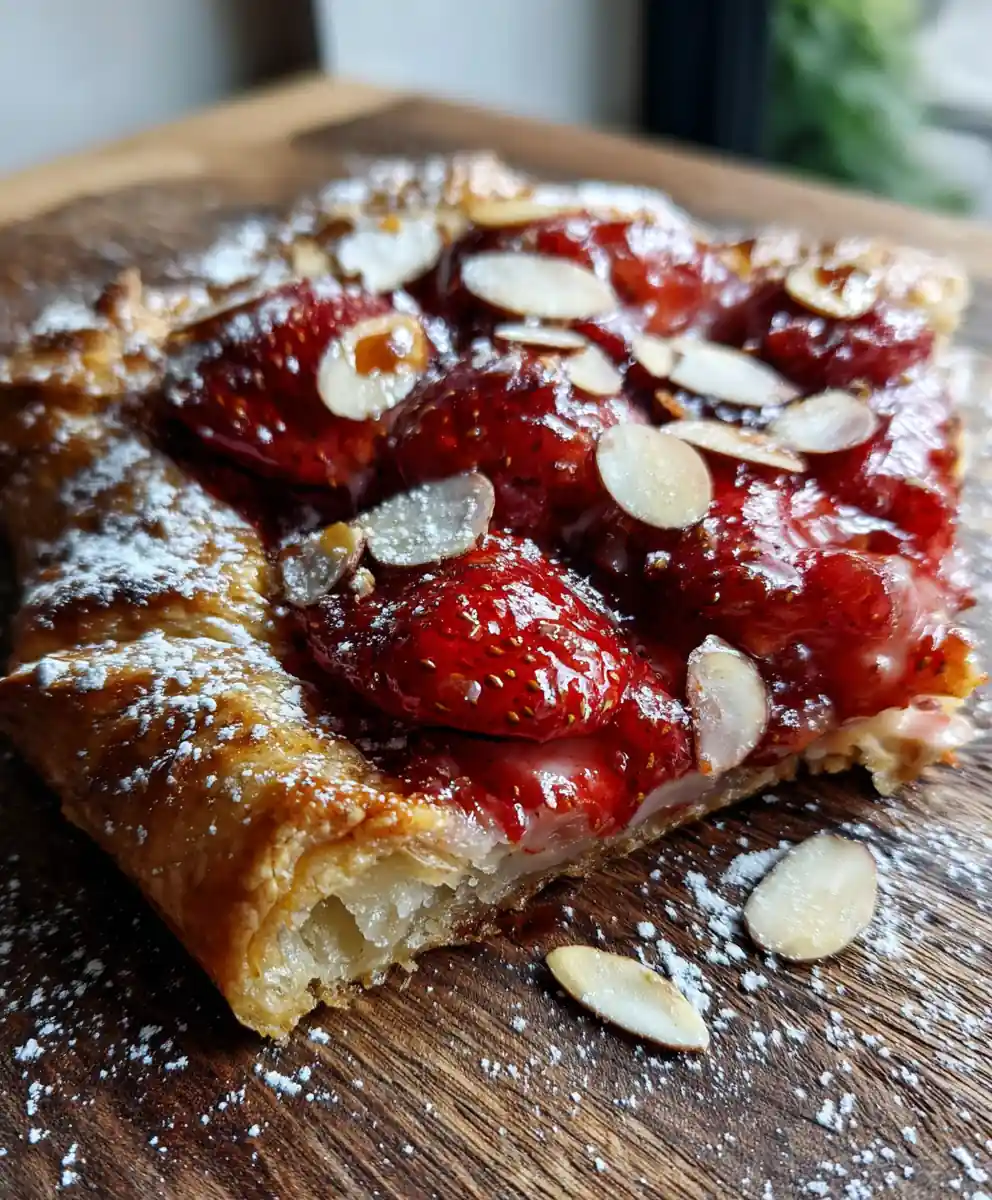 - Garnish and Serve: Serve the cooled strawberry galette. Dust generously with powdered sugar over the crust and fruit. Scatter toasted slivered almonds over the top for crunch and visual appeal.
