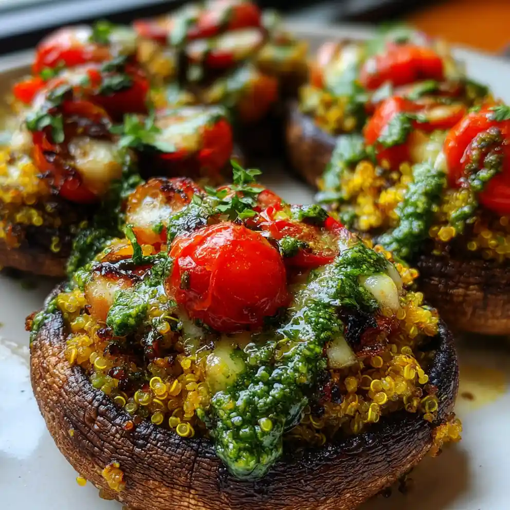 4. Add Finishing Touches: Remove from oven. Drizzle each stuffed portobello mushroom with the vibrant pesto swirl and scatter the tomato jewels. Return to oven for 5 minutes, just until tomatoes warm and pesto aroma fills your kitchen. Serve these delightful healthy easy dinner ideas immediately!