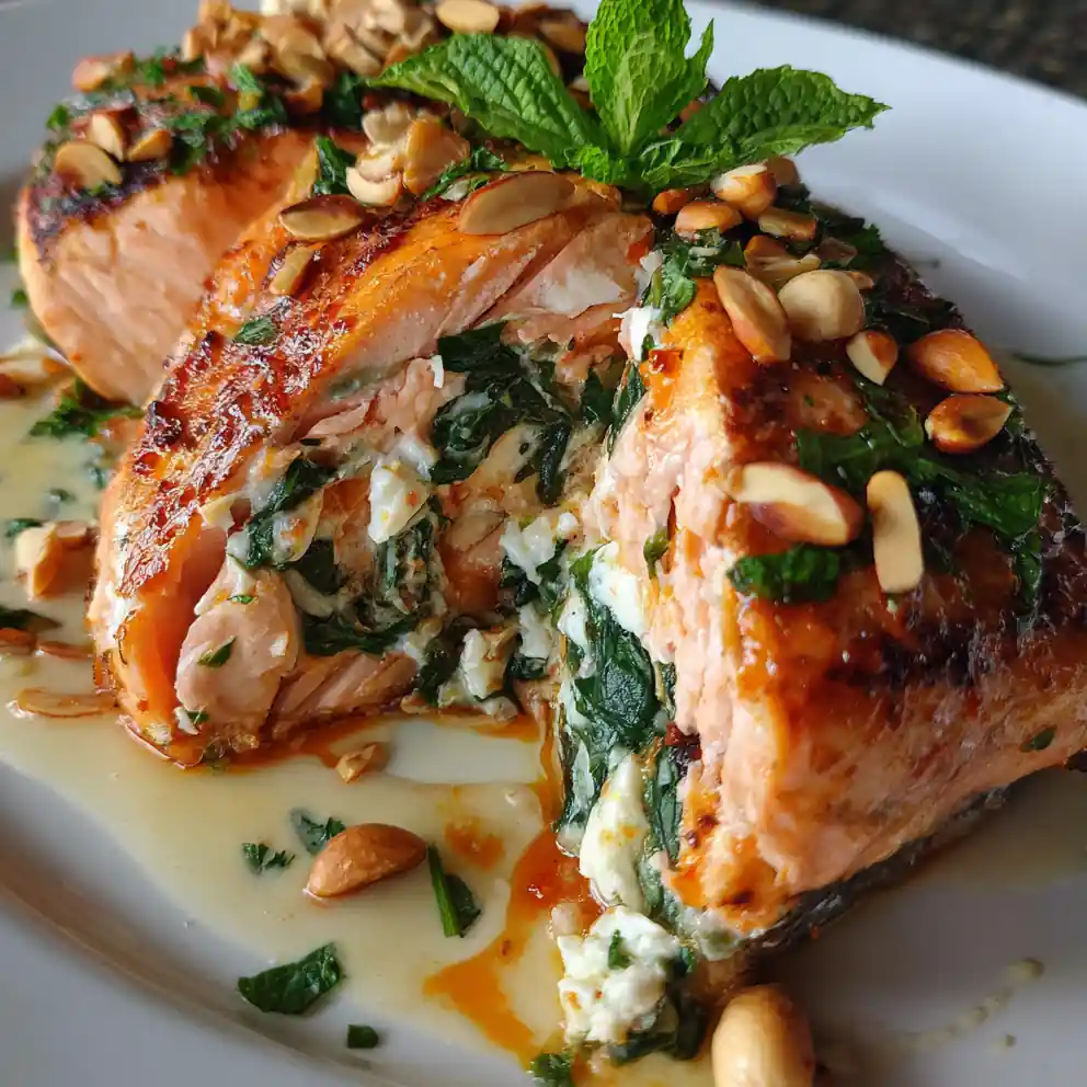 Ensure spinach is very well squeezed dry to prevent runny stuffing. If salmon looks dry, it’s likely overcooked; monitor closely. For dairy-free, use dairy-free cream cheese and nutritional yeast. For a lighter feel, use ricotta instead of cream cheese. Experiment with fresh dill, nutmeg, or sun-dried tomatoes for extra flavor. Roasted asparagus or butternut squash make great seasonal sides.
